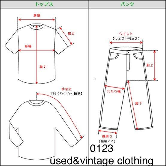 こちらの採寸方法で身幅、肩幅、着丈、ウエスト、股下、股上、裾幅を掲載しております!